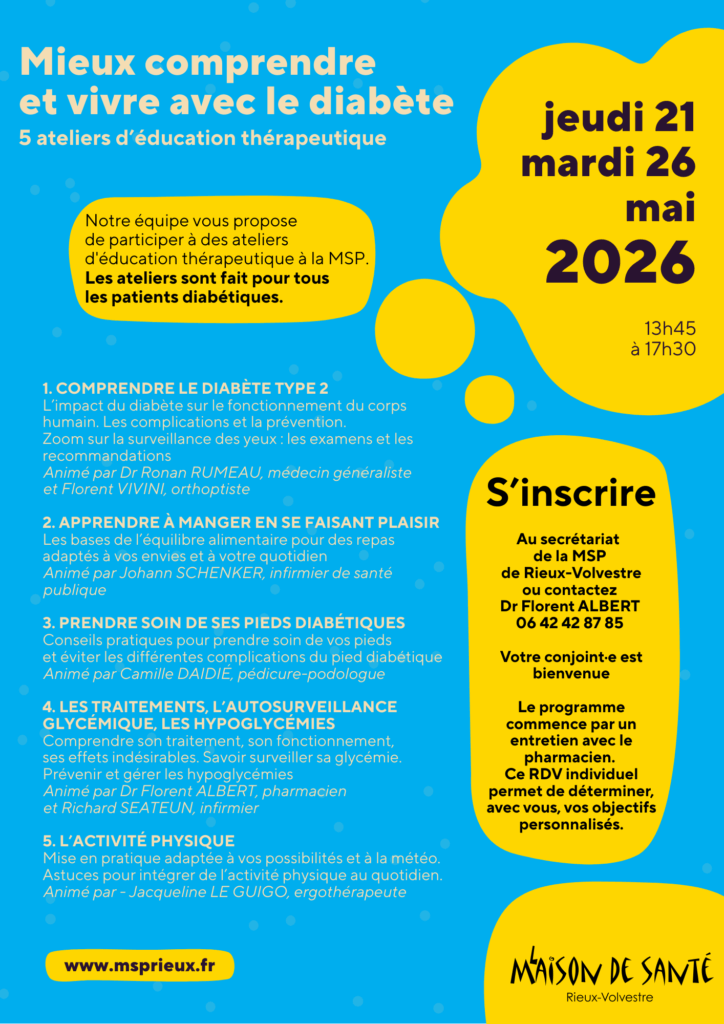 Notre équipe vous propose de participer à des ateliers d’éducation thérapeutique à la MSP.